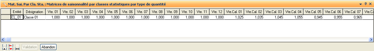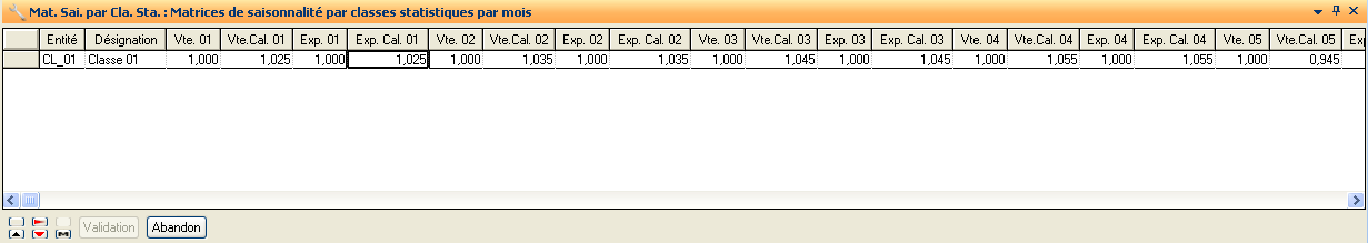 Chaque matrice de saisonnalité est composée de douze coefficients saisis dont le total doit être égal à 12. Chacun de ces coefficients correspond à l'un des mois de l'année et exprime le poids relatif qu'il occupe dans les ventes ou les expéditions annuelles.