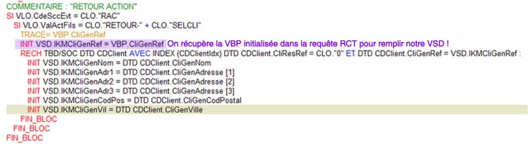 Dans l'étape précédente nous avons défini l’action “SELCLI”, qui correspond à une PSD. Cette action permet de lancer un outil qui nécessite des données en entrée pour fonctionner ! Il faudra dans cette requête initialiser les variables critères nécessaires au fonctionnement de cet l’outil. Il est possible donc possible d’initialiser des SCR/VCR et VBP à partir des VSD présentes sur votre PSD: