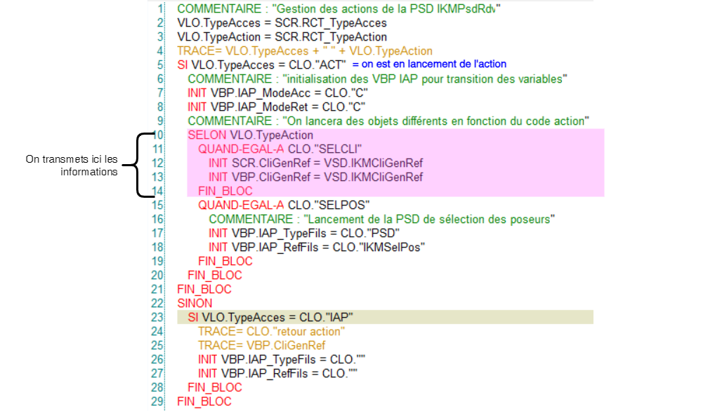 On lance l’action qui a pour code action “SELPOS”, et qui permet de lancer une PSD dans notre exemple. On vient donc initialiser les VBP IAP_TypeFils et IAP_RefFils afin de piloter dynamiquement l’objet à lancer.