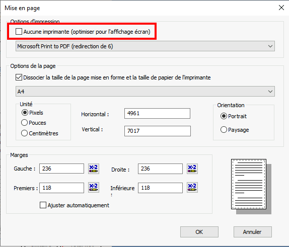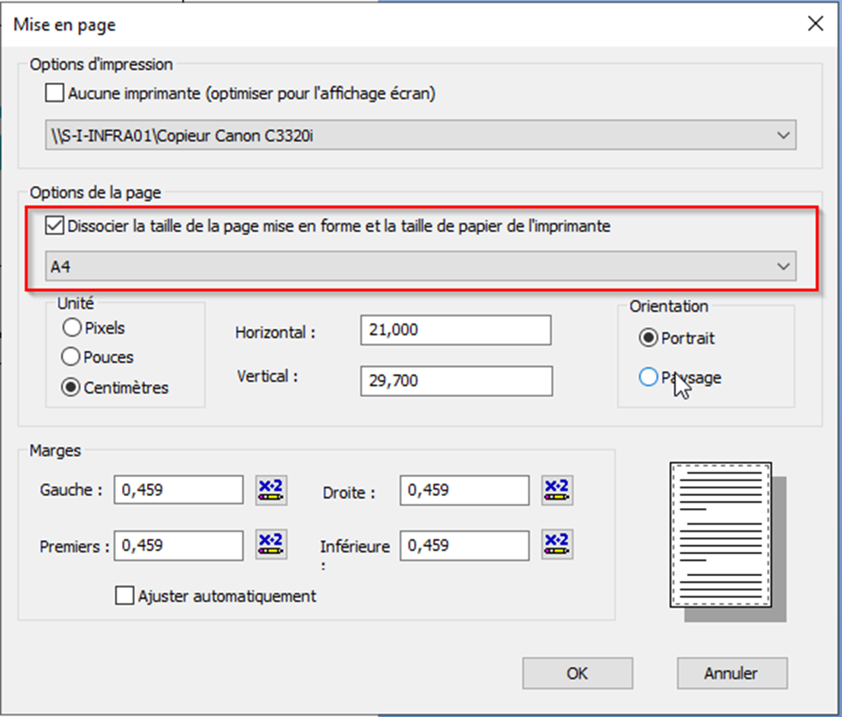 Il faut contrôler que cette case à cocher soit cochée pour diminuer les écarts entre une impression papier et fichier. C'est une recommandation de SAP™ . Le format de la page sélectionné ne doit pas être le format "Taille définie par l'utilisateur" mais un format correspondant sur l'imprimante ou le type d'imprimante qui sera utilisée. Ceci est important sur des formats particuliers comme les étiquettes.