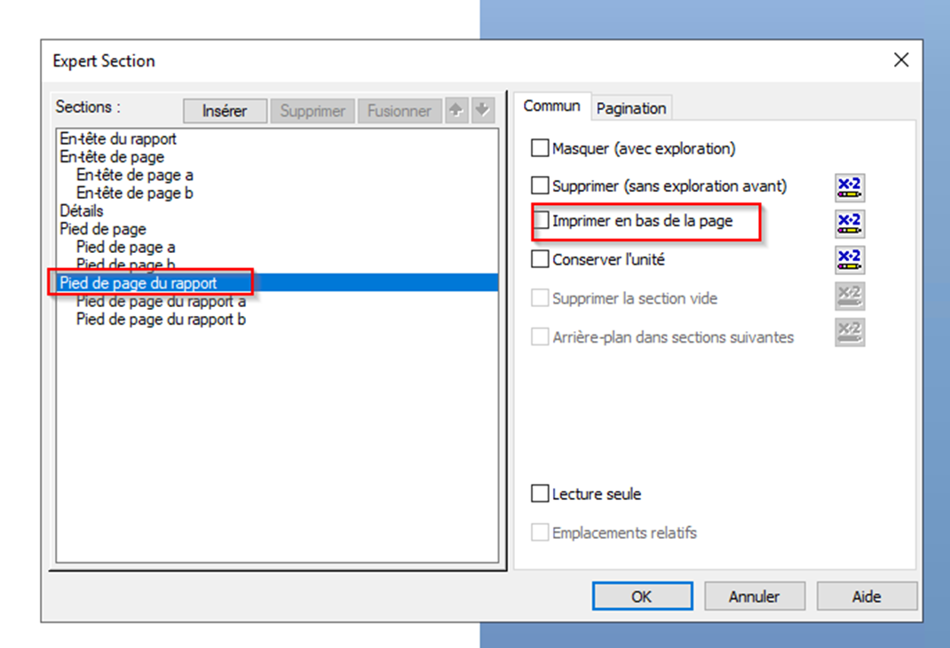 Pour éditer des pieds de rapports en bas de page, il faut cocher la zone « Imprimer en bas de page » dans l'« Expert section ». Dans le cas où il y a plusieurs pieds de rapports, pour que l'option « Imprimer en bas de page » soit prise en compte dans les sous-sections, il faut décocher cette option sur l'entête de la section et le cocher sur les sous-sections.