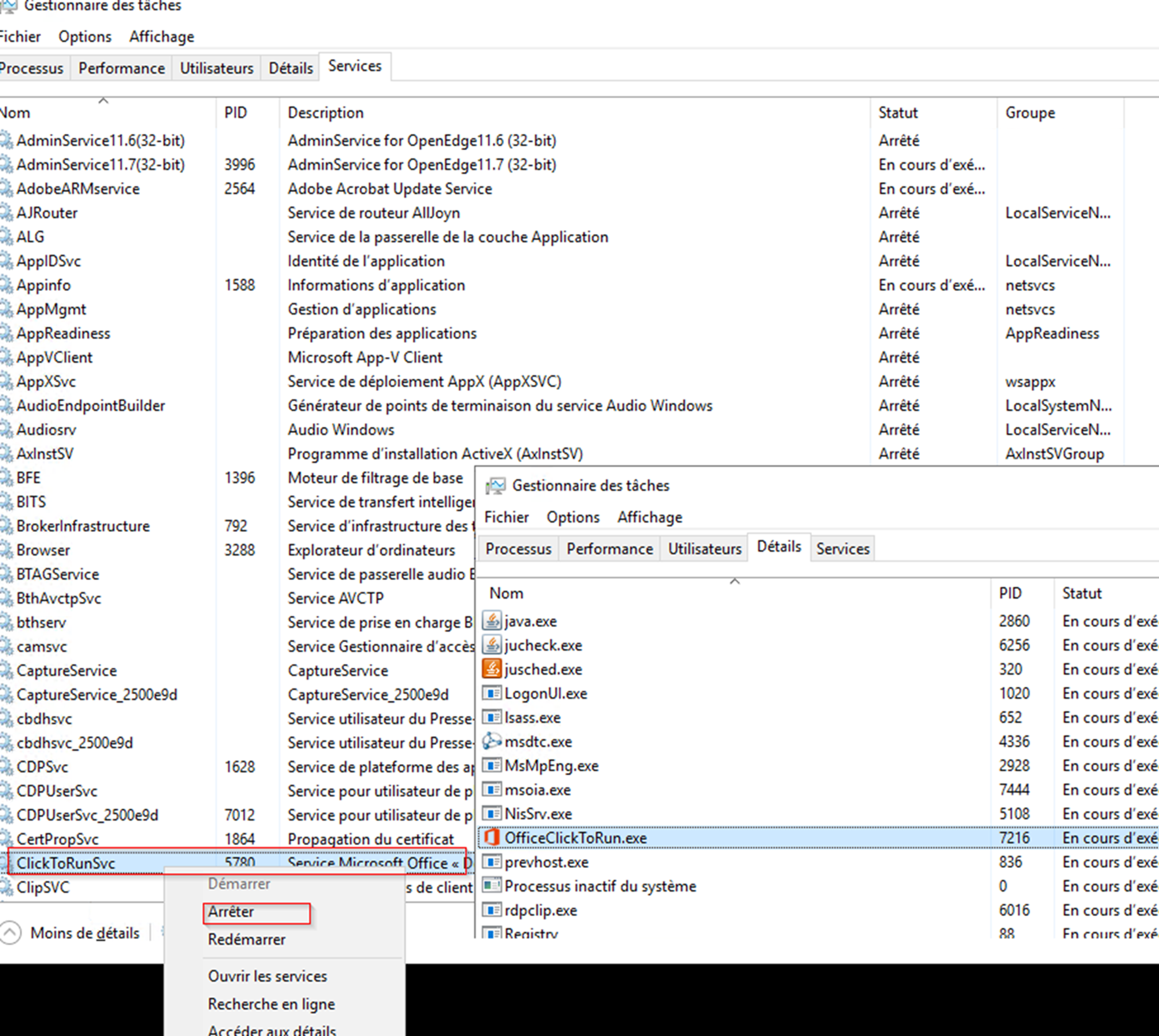 Il faut arrêter le service ClickToRunSVC (qui gère le processus OfficeClickToRun.exe) sur le serveur de services concerné.