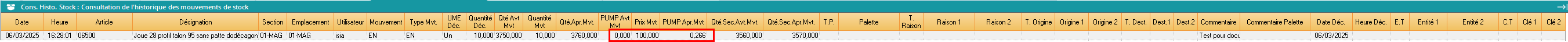 Un mouvement de sortie de stock même s’il est valorisé n’a pas d’impact sur le PUMP. Exemple en faisant le même mouvement que précédemment mais en sortie