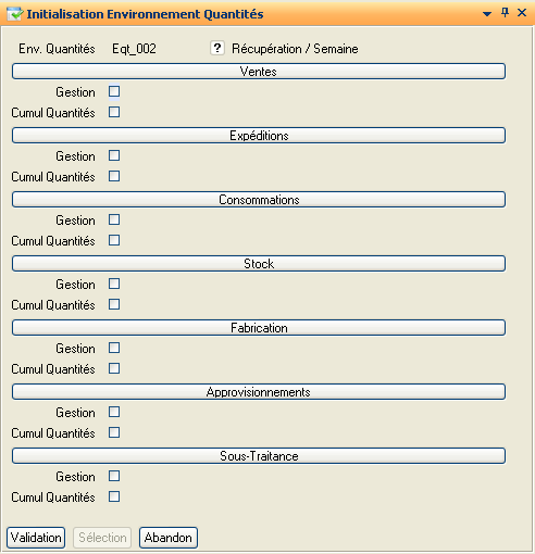 Indique si le type de quantité pour lequel la zone est cochée est à prendre en compte par la requête de d'initialisation de l'environnement quantités. Zone facultative.
