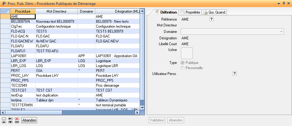 Cette application présente les procédures publiques et permet de modifier l’apparence des ces dernières : Mot directeur, Domaine, Désignation, libellé court et Icône sont modifiables.