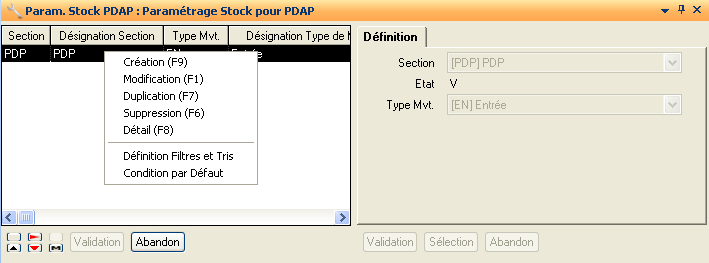Définition du paramétrage du stock utilisé lors du calcul du PDAP. La définition de ce paramétrage pour une section indique qu’avant toute récupération, l’historique de cette section sera purgé.