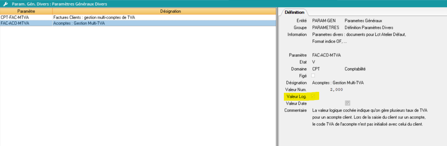 Si vous souhaitez passer en gestion des acomptes en multi-taux, le paramètre général divers accessible depuis l’explorateur/Paramètres/Paramètres généraux divers FAC-ACO-MTVA est à activer :