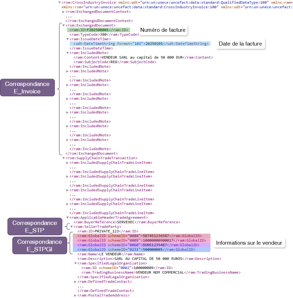 Ici, la balise <ram:GlobalID> est présente plusieurs fois dans le bloc <ram:SellerTradeParty>, mais également dans d’autres blocs ( dans le bloc des informations de l’acheteur notamment !)