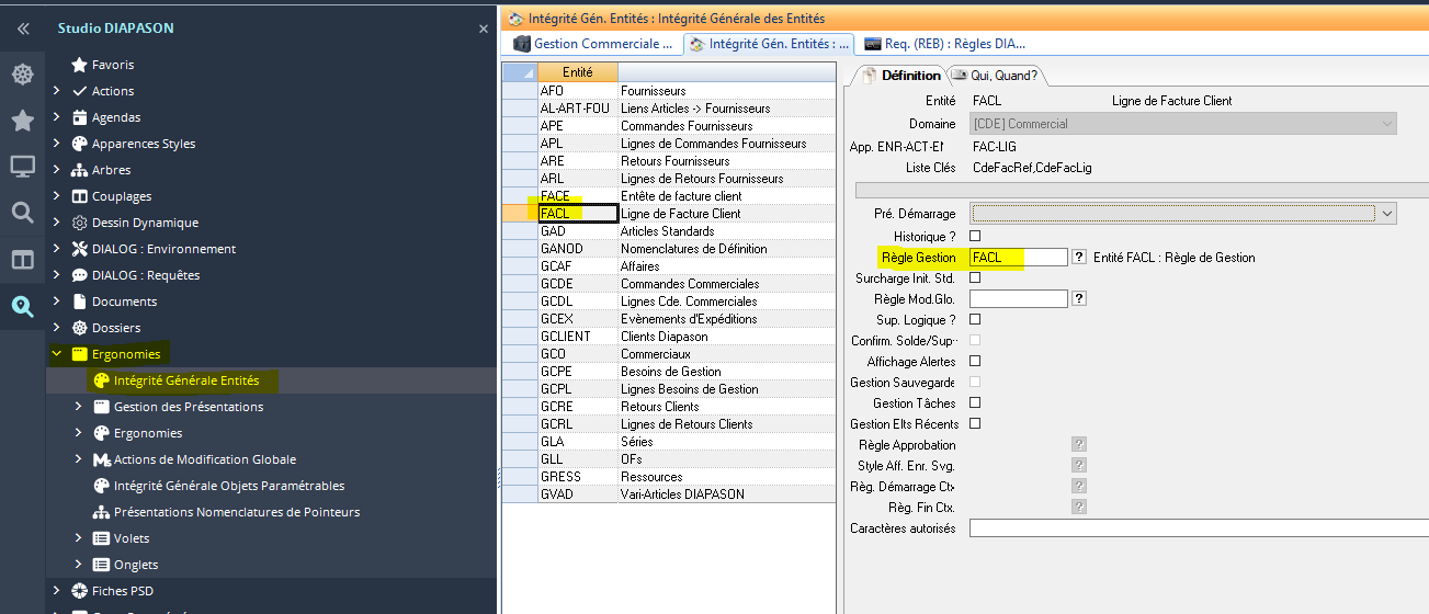 Pour savoir si une requête existe, aller dans Ergonomie/Intégrité Générale Entité puis se positionner sur l’entité FACL :