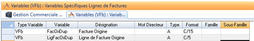 Les deux nouvelles variables spécifiques de type VFb Facture d’origine et Ligne de facture d’origine sont à créer, afin de stocker lors de la création de la ligne d’avoir , la ligne de facture origine liée :