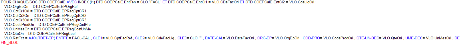 Pour récupérer le montant de l'éco-participation des lignes de la facture d’origine sur les nouvelles lignes en avoir ou en duplication de facture, il sera nécessaire dans la requête entité exécutée lors de la création de chaque nouvelle ligne de facture ( Entité FACL) de forcer la récupération de l'éco participation calculée sur la ligne d’origine. Cette “récupération” devra être réalisée via une fonction macro langage dédiée ( RECCAL-EP ), qui attend en paramètres d’entrée le numéro de facture ainsi que la ligne de facture d’origine. L’utilisation de cette fonction permettra de “recopier” les différents détails d'éco contribution de la ligne d’origine sur la ligne courante et de remettre a jour automatiquement les montants HT et TTC de la ligne et de l’entête de Facture.