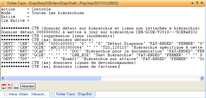 Dossier défaut <<référence dossier>> à mettre à jour sur hiérarchie <<clés de la hiérarchie>> (Type= CEN,ENT,TDY / Entité,Entité,’’ /Clé 1 entité,’’,’’/’’,’’,’’/’’,’’,’’/Hiérarchie). En mode « Mise à jour », le dossier défaut est automatiquement maintenu sur la hiérarchie.