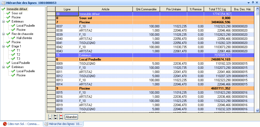 Cette fonctionnalité a été ajoutée afin d’afficher les lignes de devis/Commandes et facture de manière hiérarchisée, c'est-à-dire que la liste des lignes est classée selon une arborescence. Celle-ci a pour but de faciliter la saisie sur les lignes entités doubles lorsqu’elles sont nombreuses.