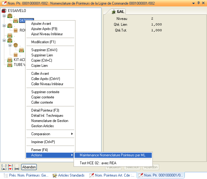 Liste des champs affichés lors de la visualisation/modification de la nomenclature. Partie arborescence de la nomenclature. La gestion du ‘détail Pointeur’ est accessible depuis l’accès en modification de la présentation.