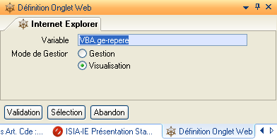 Il est possible de définir parmi les onglets d’une fiche un ou des onglets qui contiendront un « Internet Explorer » permettant d’afficher des documents (textes, graphiques, pages HTML) ou bien des URL.
