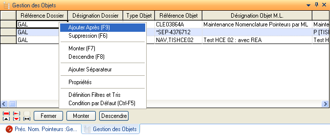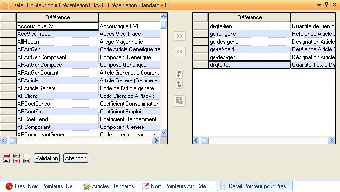 Ces informations constituent la partie de gauche lors de l’accès en visualisation / modification de la nomenclature de pointeur.