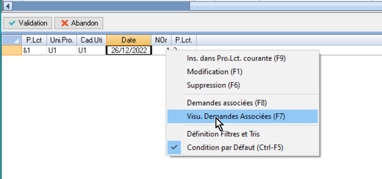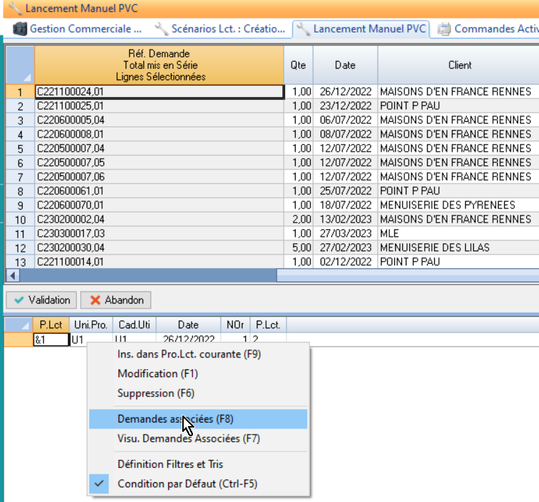 L’action Demandes Associées permet de sélectionner les demandes de fabrication affectées à la proposition de lancement en cours.