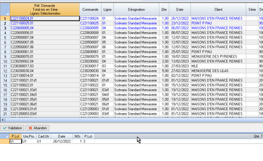 pour le série &1, le contrôle n’est pas OK car pour la demande de fabrication affichée en rouge, la ligne de commande est en attente d’intégration ! La série &1 ne pourra pas être créée. Pour toutes les autres demande de fabrication de cette série (en jaune), le contrôle affiche donc “Lig.Cde Non Lancée car Pb. sur Série”. Cela signifie que le contrôle de ces lignes est OK, mais qu’elles appartiennent à une série dont au moins une Demande de Fabrication est à problème.