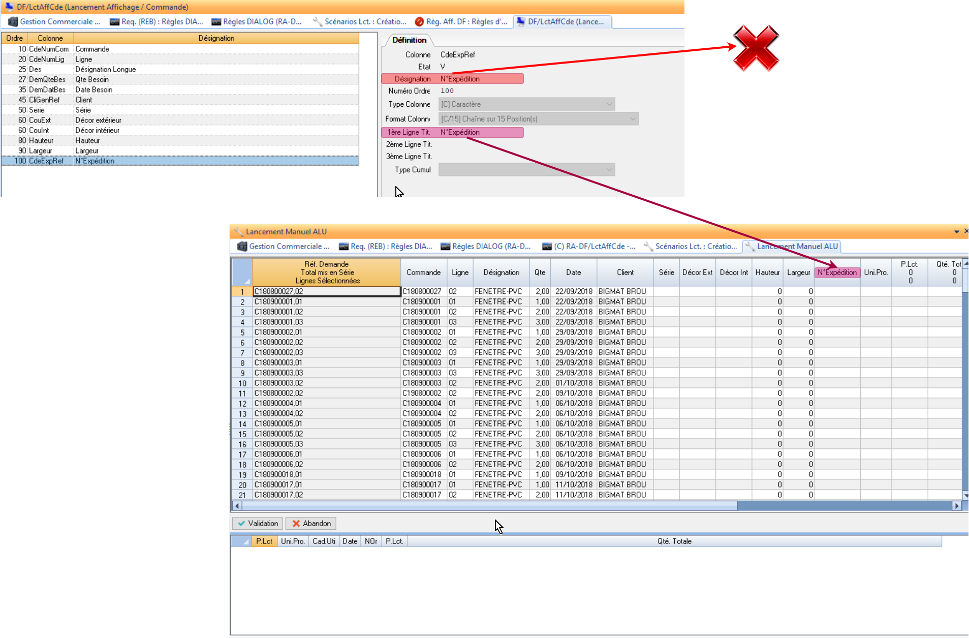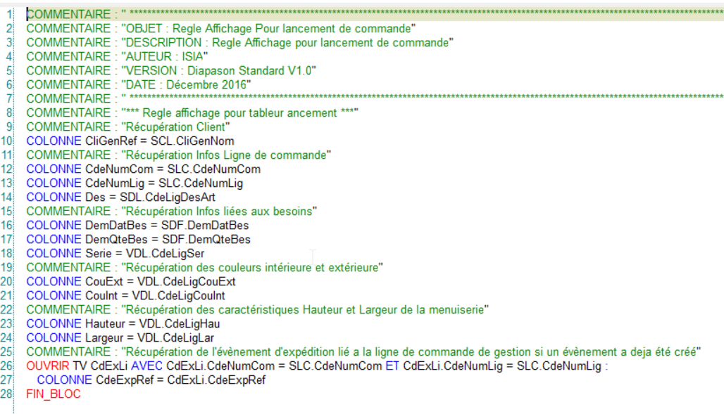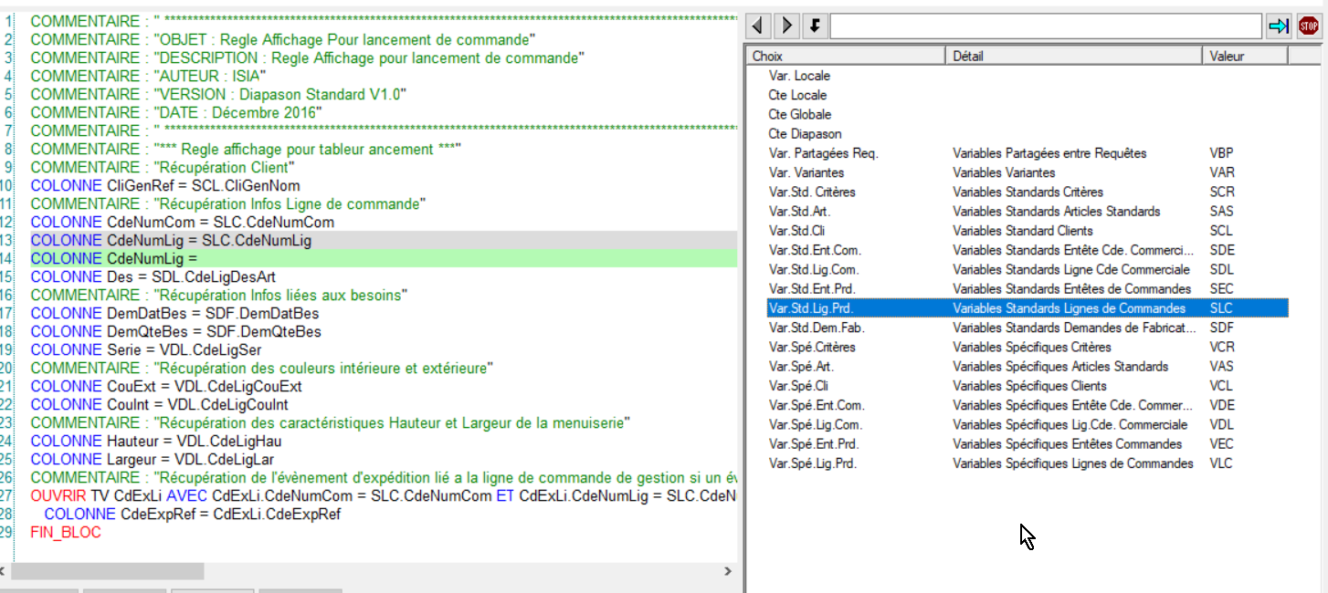 Dans cette requête, toutes les variables des entités liées sont accessibles ! Par exemple, si la demande de fabrication est issue d’une commande, on va pouvoir accéder directement aux variables de la ligne de gestion, de la commande, du client…comme on le voit ci-dessous :
