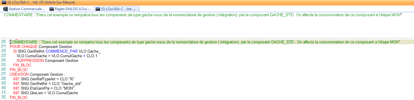 les variables SLL.StoFluSecSorRef et SLL.StoFluSecSorTMo (pour les mouvements de stock relatifs aux composants de gestion de l’article fabriqué). Il faut alors faire un boucle POUR CHAQUE composant de gestion de l’article fabriqué.