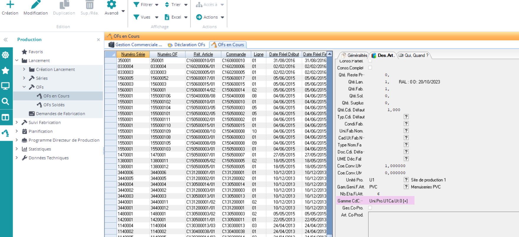 Cet événement est de type planification : la colonne numéro de commande contient le numéro d'OF, la colonne ligne contient « OF ». Il s'intègre de la même manière qu'un événement de planification de ligne de commande (sélection par bloc, traitement répétitif).