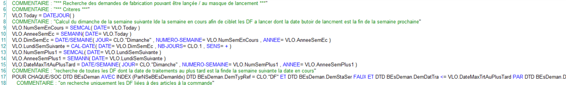 Cette requête est lancée au moment où on ouvre le tableur de lancement: elle permet d’extraire et d’afficher les demandes de fabrication à prendre en compte pour le lancement parmi toutes les demandes de fabrication existantes.