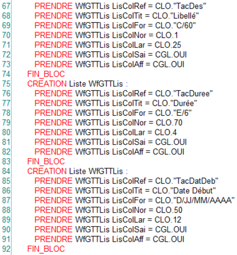 ![]() | On gère les colonnes affichées dans le tableauCes champs permettent de donner des informations sur les tâches. On a différentes informations standard disponibles, et on peut également utiliser des champs banalisés pour personnaliser la tache en plus des informations obligatoires. Il suffit pour cela de mettre le libellé de champs qui nous convient. Ces champs sont listés ci-dessous: Pour afficher les colonnes, on va remplir la liste WfGttLis: Dans cette liste, on vient déterminer toutes les colonnes à afficher avec: