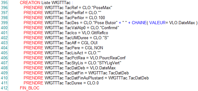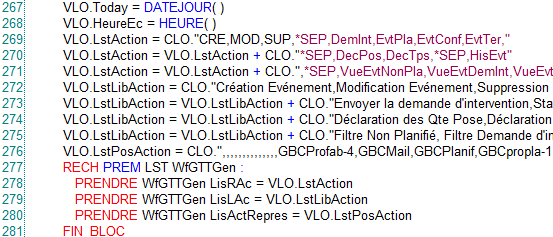 Pour chaque tache, il est nécessaire d’indiquer exhaustivement la liste des actions qui lui sont affectées : PRENDRE WfGTTTac TacLisAct = VLO.LstAction. On défini dans la liste WFGTTGen la liste totale des actions disponibles pour le Gantt et si elles sont présentes ou pas dans la barre de commandes et ensuite tache par taches, quelles actions sont rattachées a cette tache. |