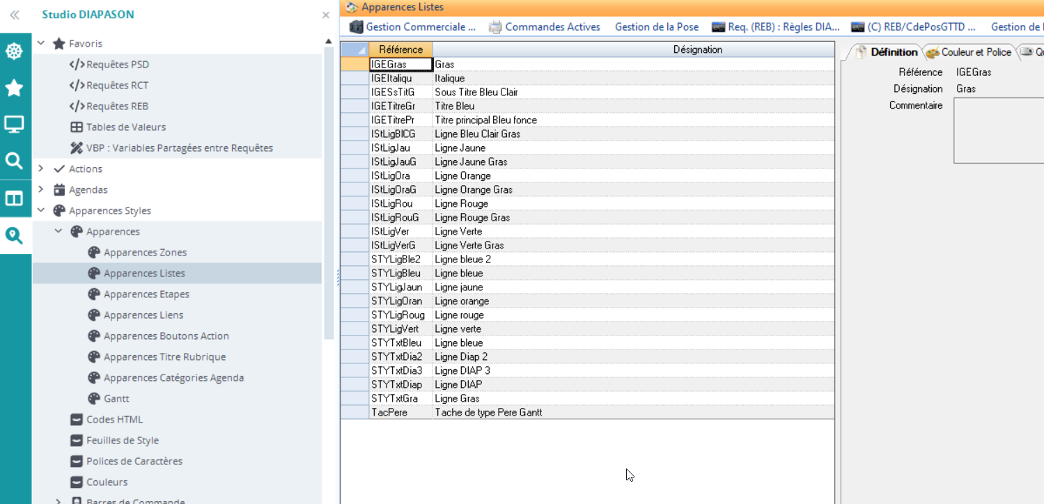 Cette requête REB est lancée au démarrage du GANTT. Elle permet d’initialiser la structure visuelle des colonnes définissants les taches , et de déterminer exhaustivement les différentes tâches qui apparaissent sur le GANTT ( toutes les taches d’un Gantt ne sont nécessairement a afficher pur tous les profils utilisateurs, cela peut par exemple simplifier la lecture d’un Gantt en ciblant des taches d’un certain type : pose, fabrications…) !