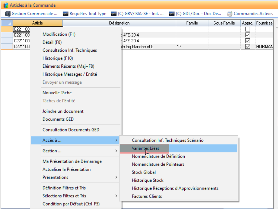 Où consulter les variantes pour un article à la commande ?