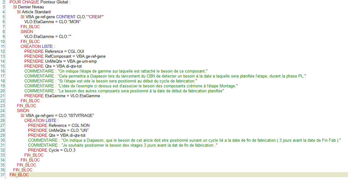 On peut mettre à cet endroit là l'étape de la gamme à laquelle le composant est consommé !!! Pour mieux comprendre ce qu’est la gamme et à quoi ça sert, RDV ici ! Ici, par exemple, on associe le composant CREM ( la crémone) à l'étape MON ( le montage), en utilisant PRENDRE EtaGamme=VLO.EtaGamme. Cas particulier du vitrage: pour éviter de stocker ( et donc d’abimer !) le vitrage, on le commande en général quelques jours avant la date de fin de fabrication pour qu’il arrive directement pour être monté. Ici, on décide de le commander seulement 3 jours avant la date de fin de fabrication avec le mot clé PRENDRE Cycle=CLO.3 ! Par défaut, même en l’absence de RV3, DIAPASON créé une nomenclature de gestion qui contient uniquement les articles standard gérés en stock. Si vous ne souhaitez pas gérer les stocks dans DIAPASON ( et donc ne pas faire de consommations de composants), il faire un seul CREATION LISTE et PRENDRE RefComposant=CLO.”NON_GERE”. |