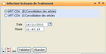 Cette action a pour but de lancer le calcul de consolidation sur le scénario courant. Ce calcul passe par l’exécution d’un traitement « ART-CONSOL » dont la saisie de critères permet de définir les caractéristiques du calcul telle que :