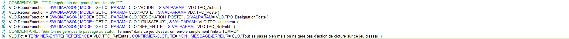 CONFIRMER-CLOTURE | E | Oui | Logique | On confirme ou non le passage au statut terminé. Peut être donné par une variable locale ou une constante globale. |