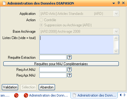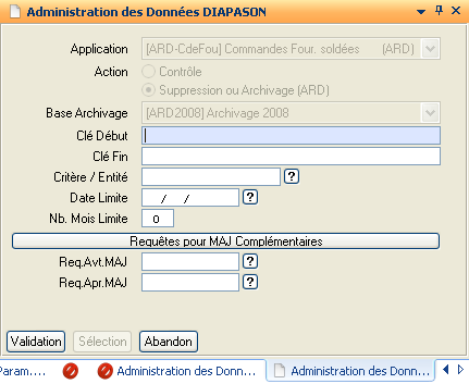 Champ de type combo (liste) permettant de sélectionner l’application de traitement. Les applications commençant par « ARD » archivent les données avant de les supprimer, celles commençant par « SUP » font de la suppression de données uniquement.
