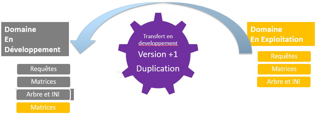 Le couple domaine-version en exploitation est transféré dans l’environnement de développement et son statut est figé. Il ne sera pas modifiable. Il peut être transféré en exploitation à tout moment pour revenir à cette version lors des calculs à venir. Il peut servir de support de paramétrage à la suite d’une duplication donnant lieu à une nouvelle version du domaine.