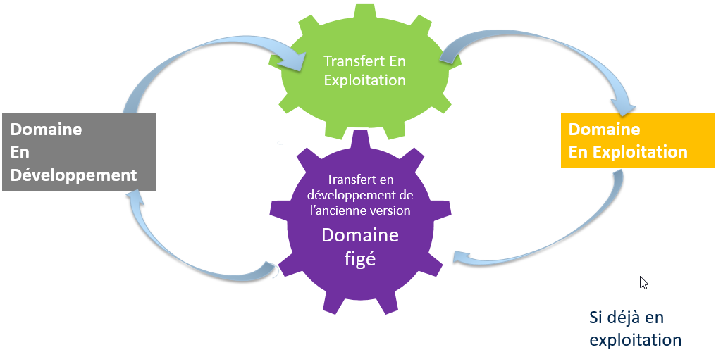 Durant le transfert d' un domaine en exploitation vers le développement, le domaine résultat est bloqué jusqu'à ce que la duplication de tous les éléments rattachés soit terminée.