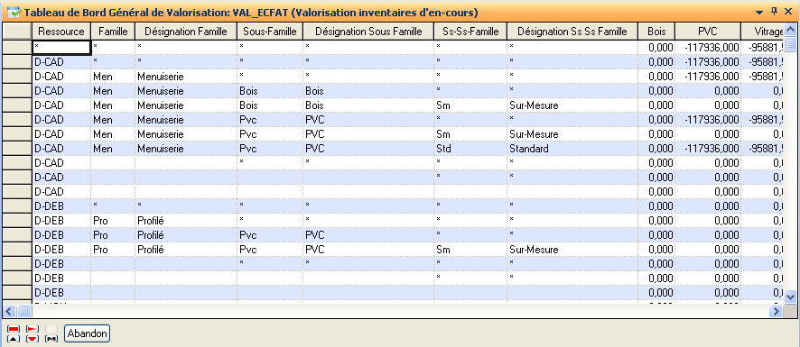 Cette action présente le résultat du calcul de valorisation par famille, sous-famille, sous-famille et par nature analytique définie sur la définition de la valorisation.