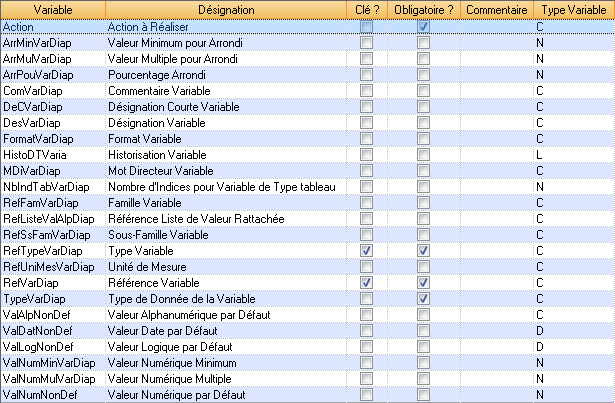 EntVar | C | DesVarDiap | Nom du champ Désignation | |