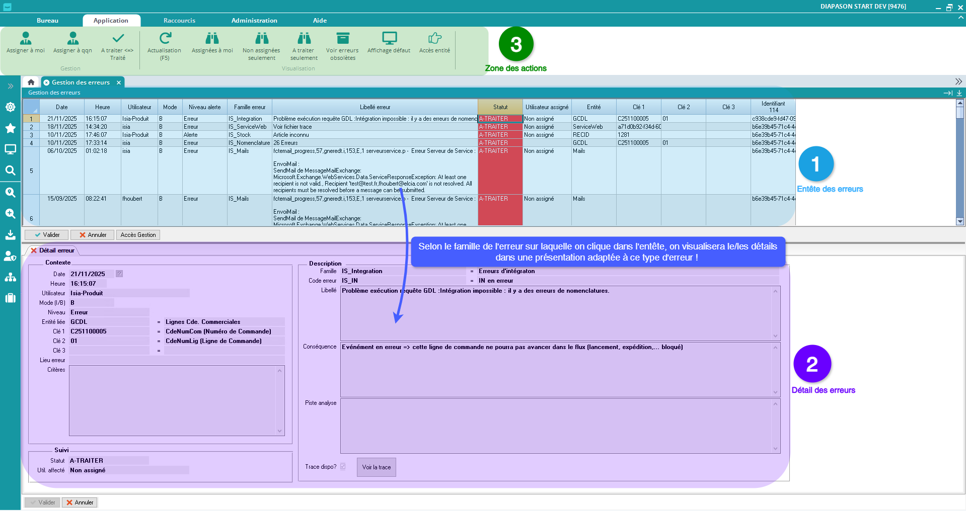 Utilisateur assigné : “Non assigné” ou loggin Diapason. Information des détails consolidée à l’entête. Par défaut une erreur est non assignée et on peut indiquer ensuite que l’erreur est prise en charge par un utilisateur. Cette notion est gérée sur les détails d’erreurs.