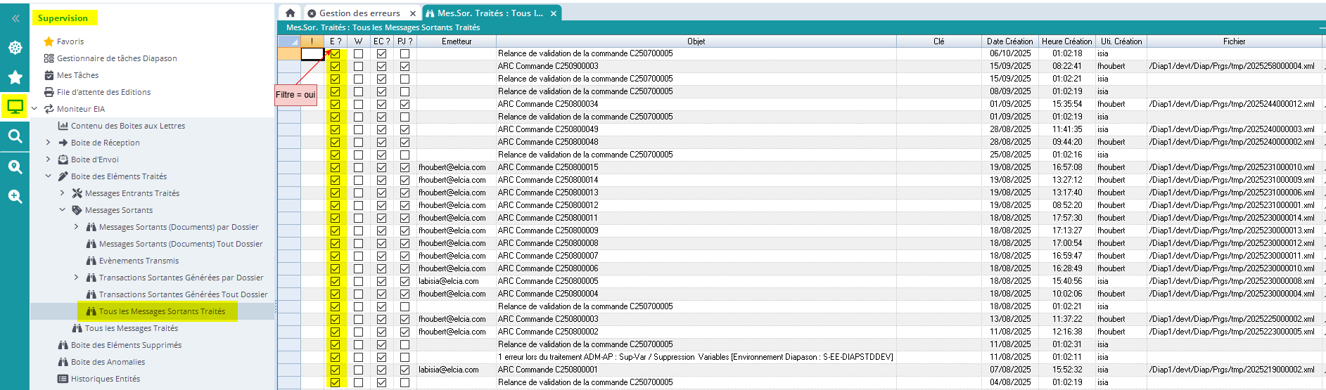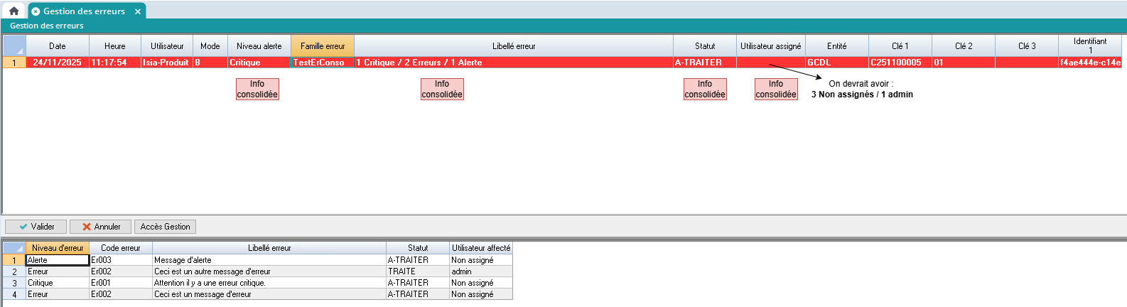 Le bouton “Gestion erreurs” donne accès au couplage de gestion des erreurs et celui-ci n’affiche que les erreurs liées à l’entité courante. Voir chapitre Paramétrer le gestionnaire d'erreurs