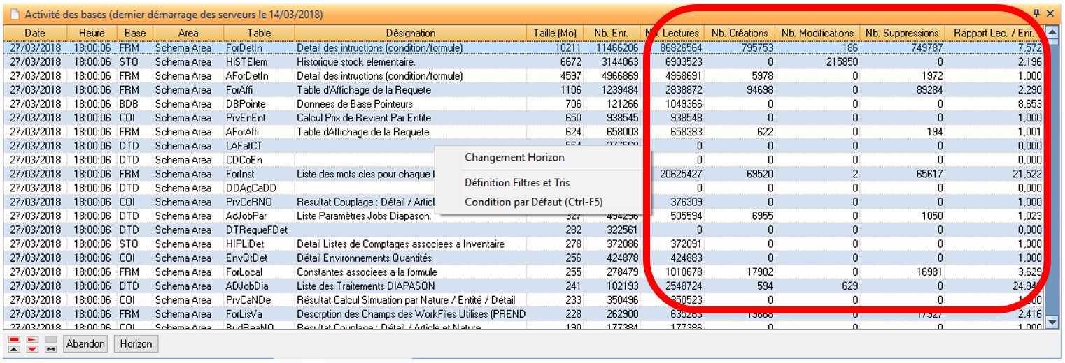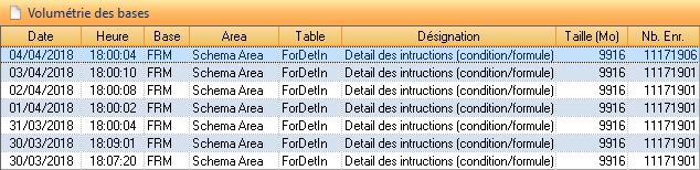 Les résultats sont stockés à date et heure du déroulement du traitement STATS-DB. Il est donc possible de suivre l’évolution d’une table sur une période donnée (changement d’horizon) en filtrant sur la table désirée.