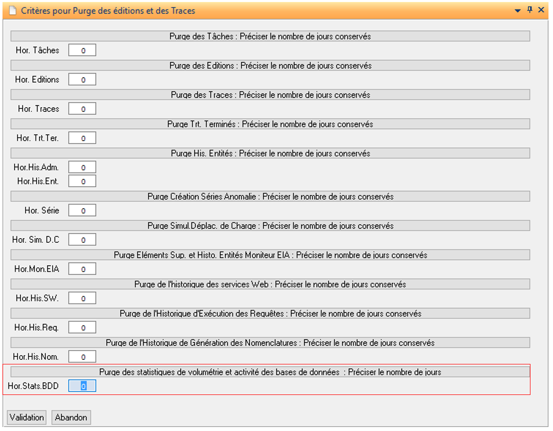 La purge des statistiques de volumétrie et d’activité des bases est faite dans le traitement Diapason « PUR-TRA : Purge des Editions et des Traces » en renseignant le nombre de jours d’historique à conserver.
